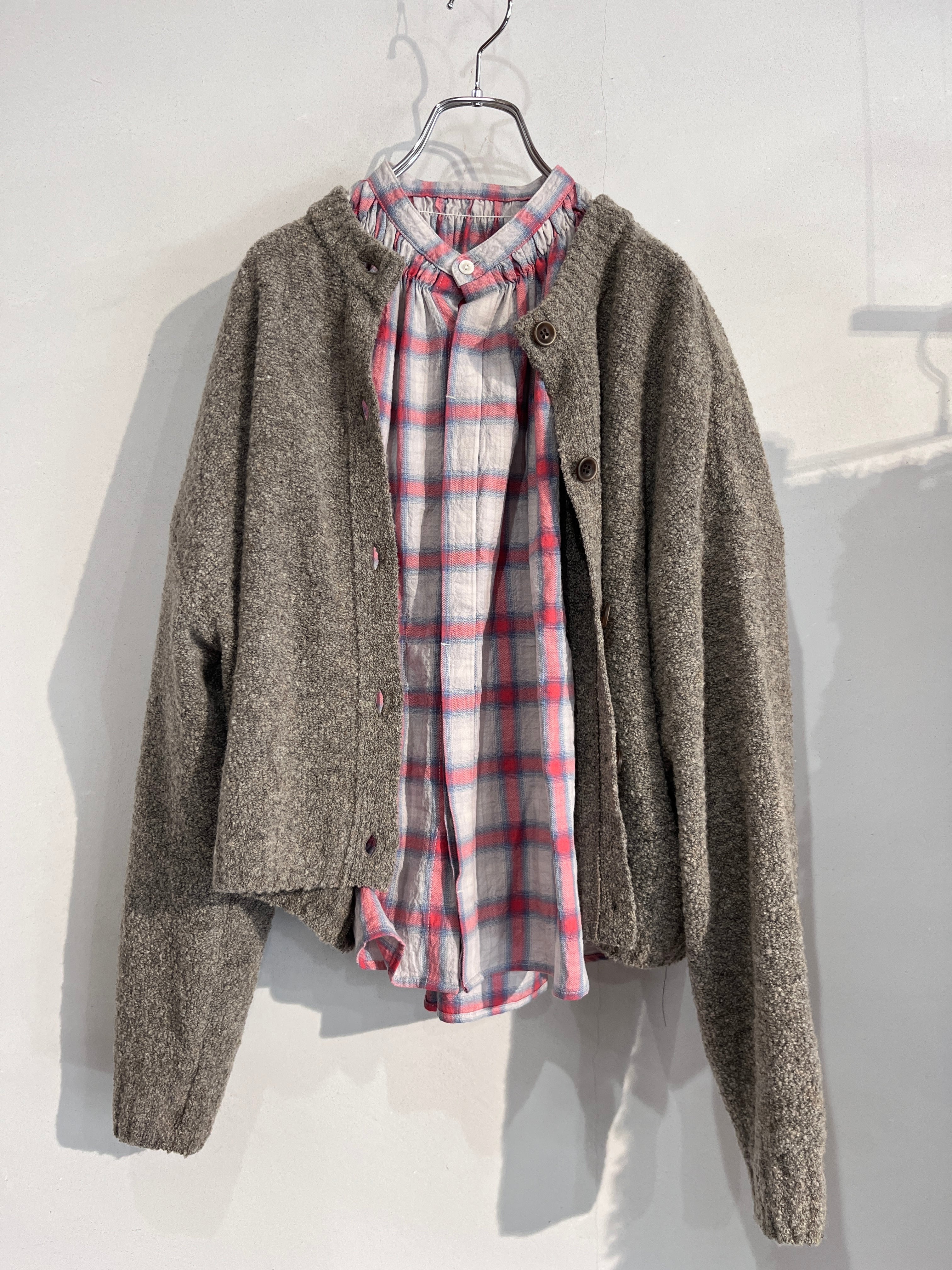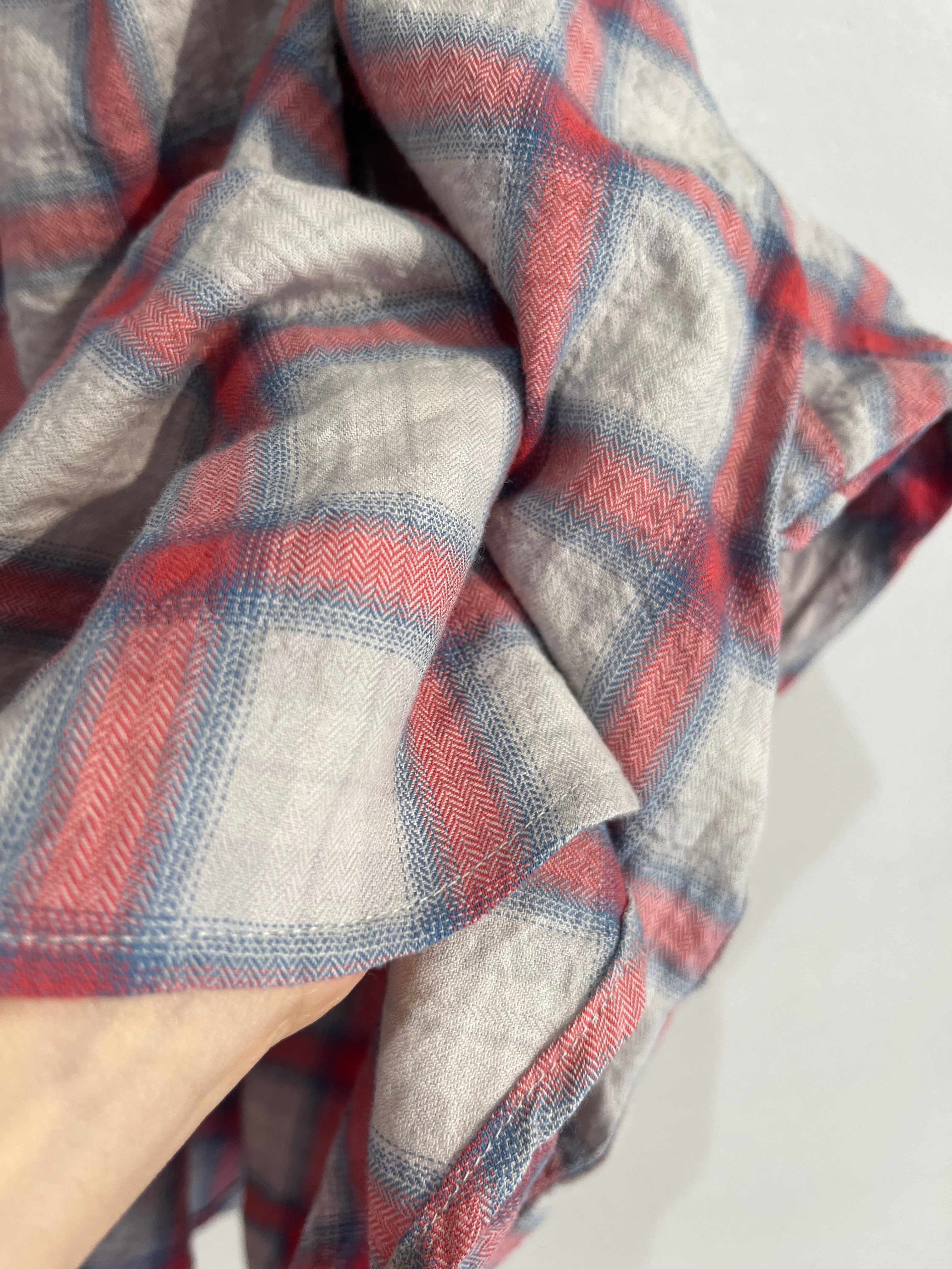 ふっくらとした柔らかいガーゼのような素材に、控えめなヘリンボン織りと大柄なチェックが