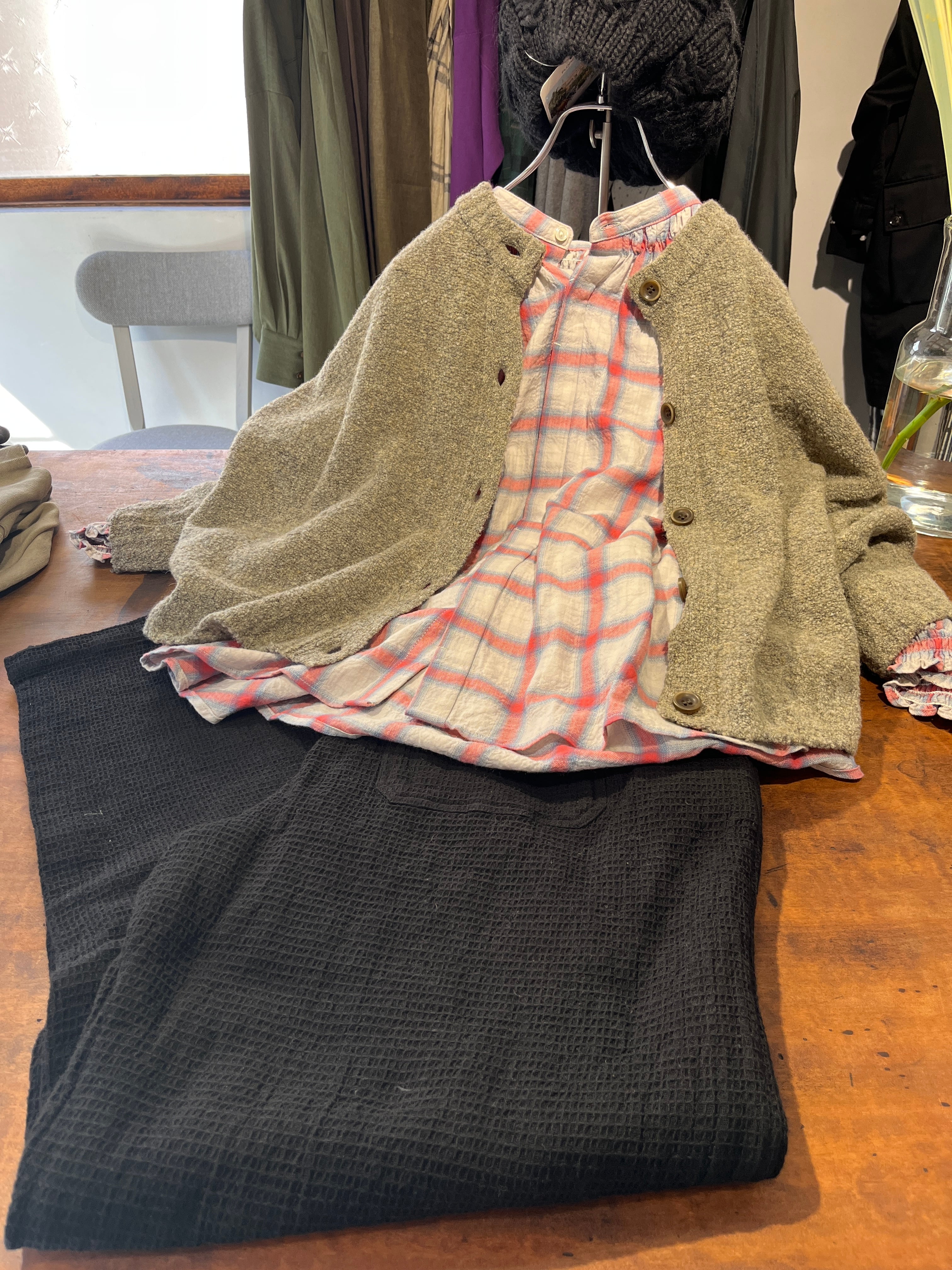 涼しくなってきたら、なかにインナーをかさねたり、柔らかい生地なのでカーディガンをはおったり。