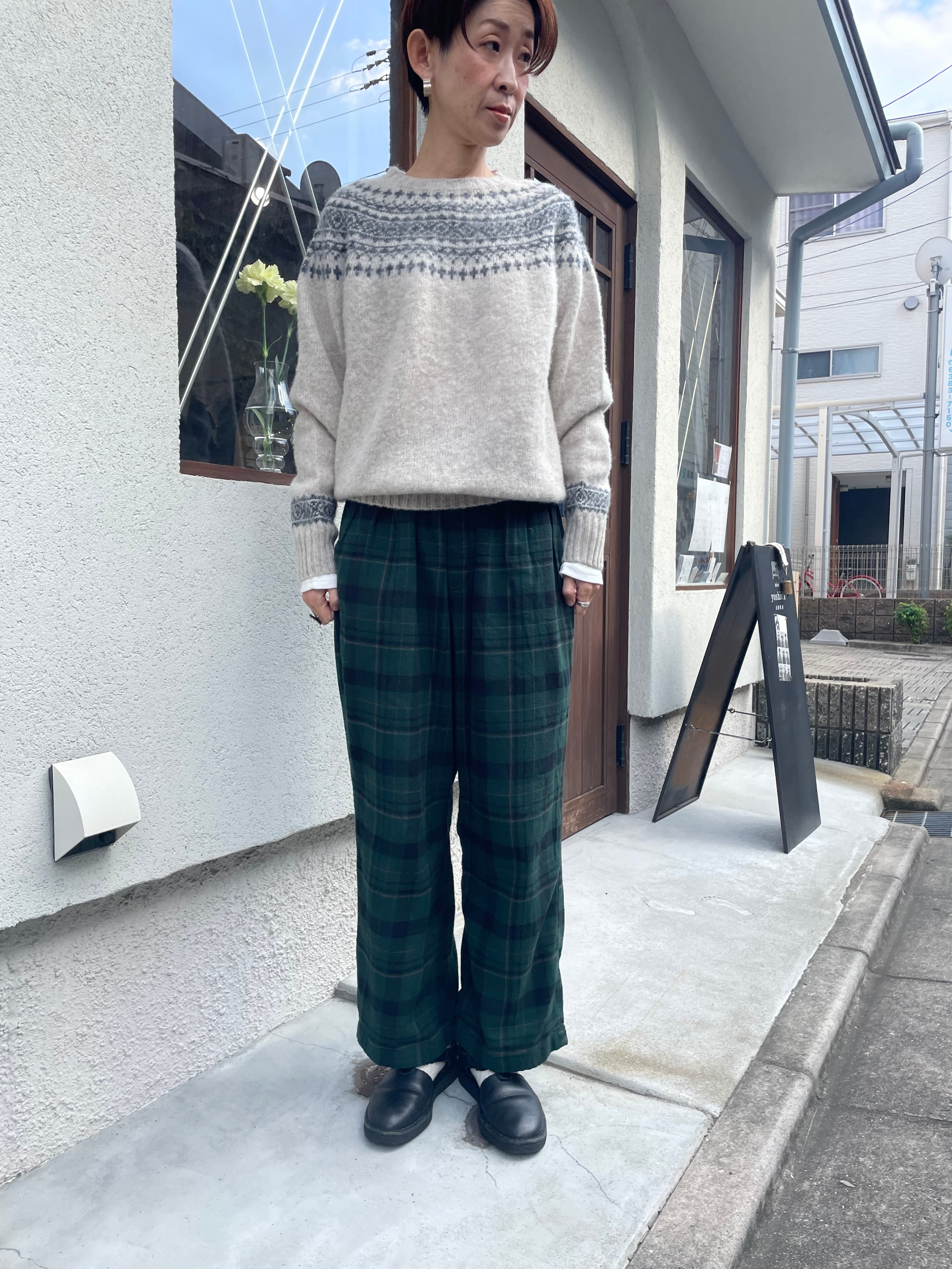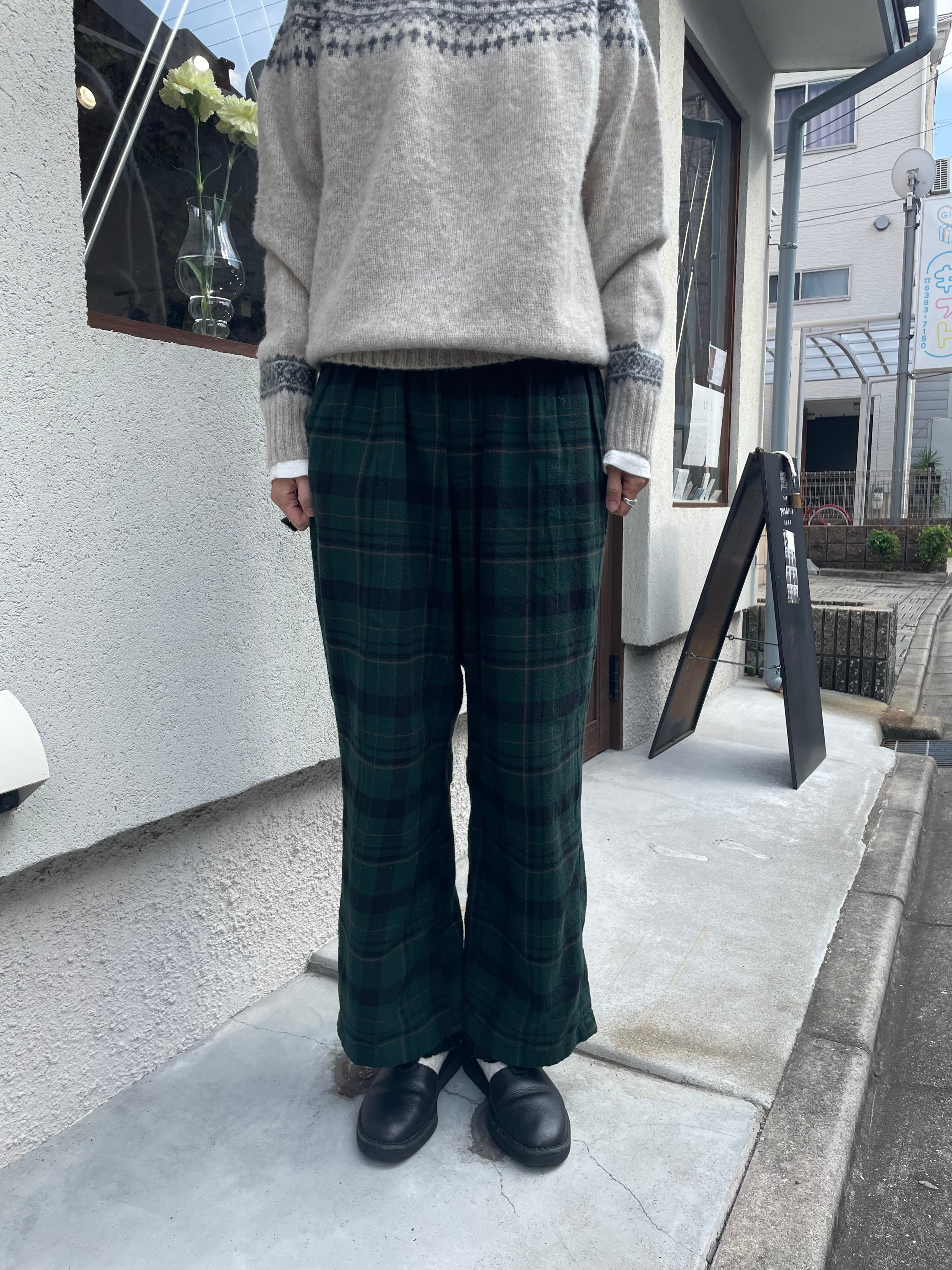 大き目のチェック柄ですが、濃淡の少ない配色なので、柄物のパンツに抵抗がある方にも