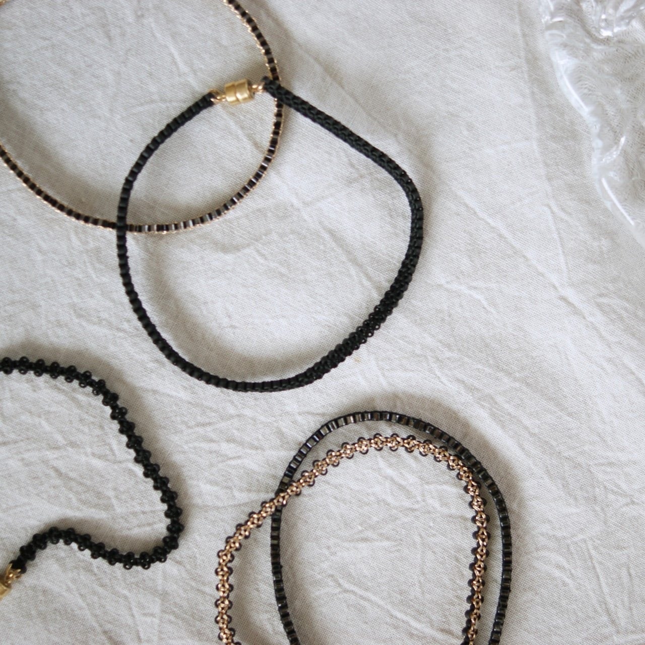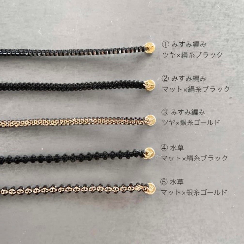 金具は14KGFです。ツヤ黒、マット黒は黒シルク糸を使用しています。