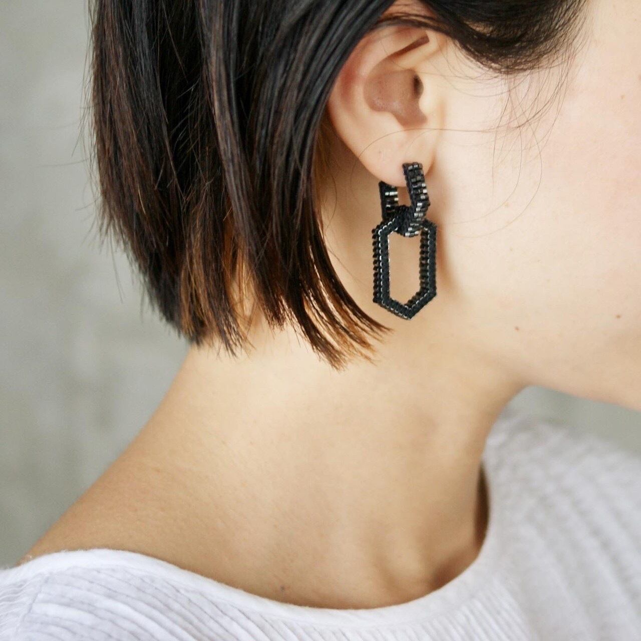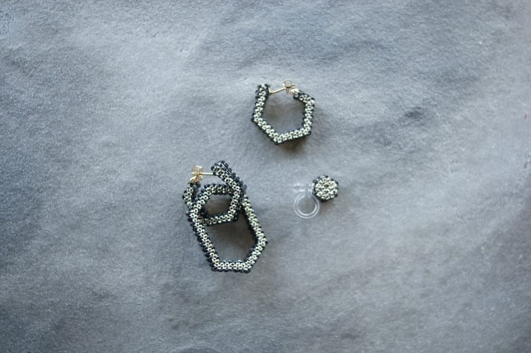 六角形のピアスが両耳。片耳はさらに六角形を通してもお使いいただけます。