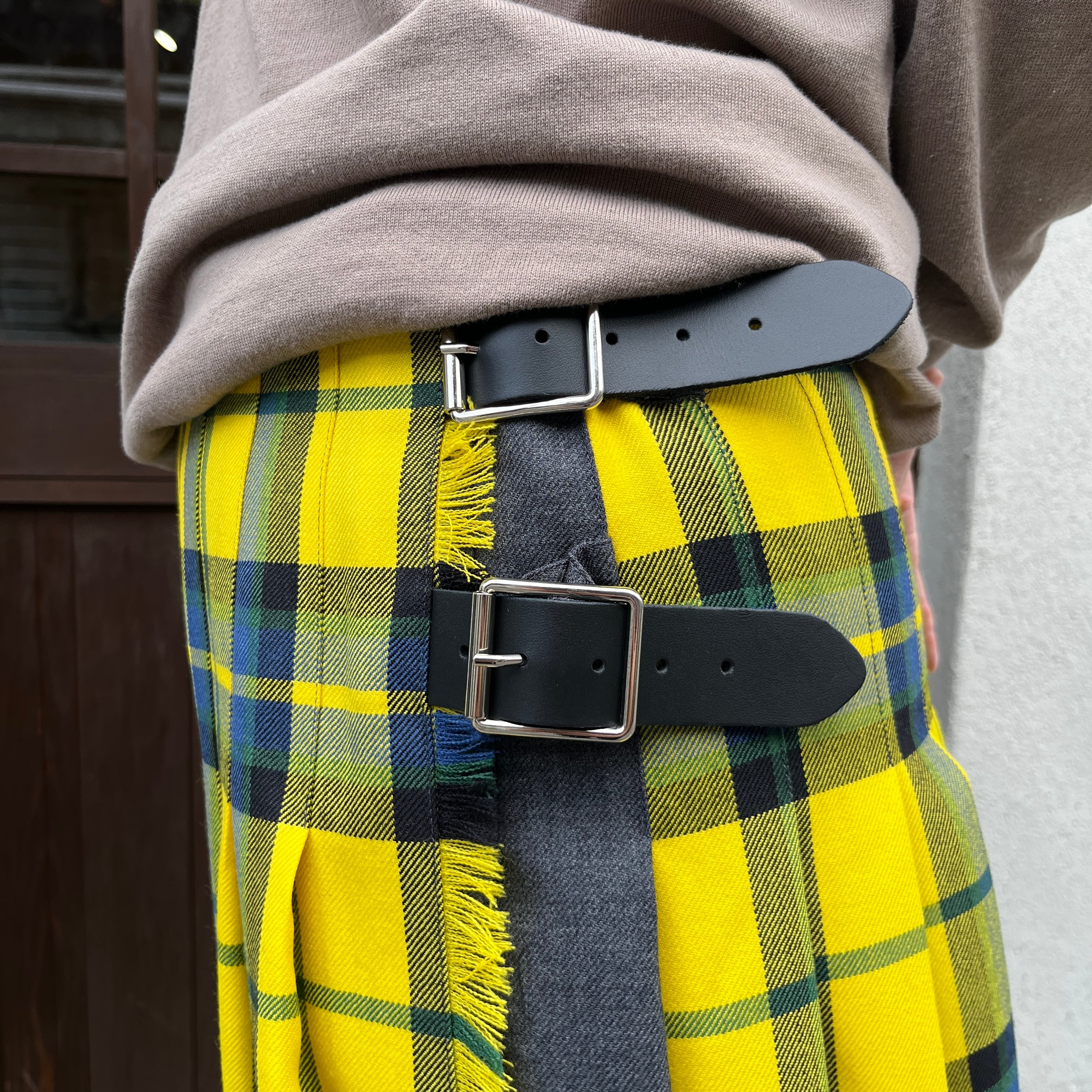 高いウエスト位置でカジュアルに合わせにくい印象のある伝統的なキルトスカートを、