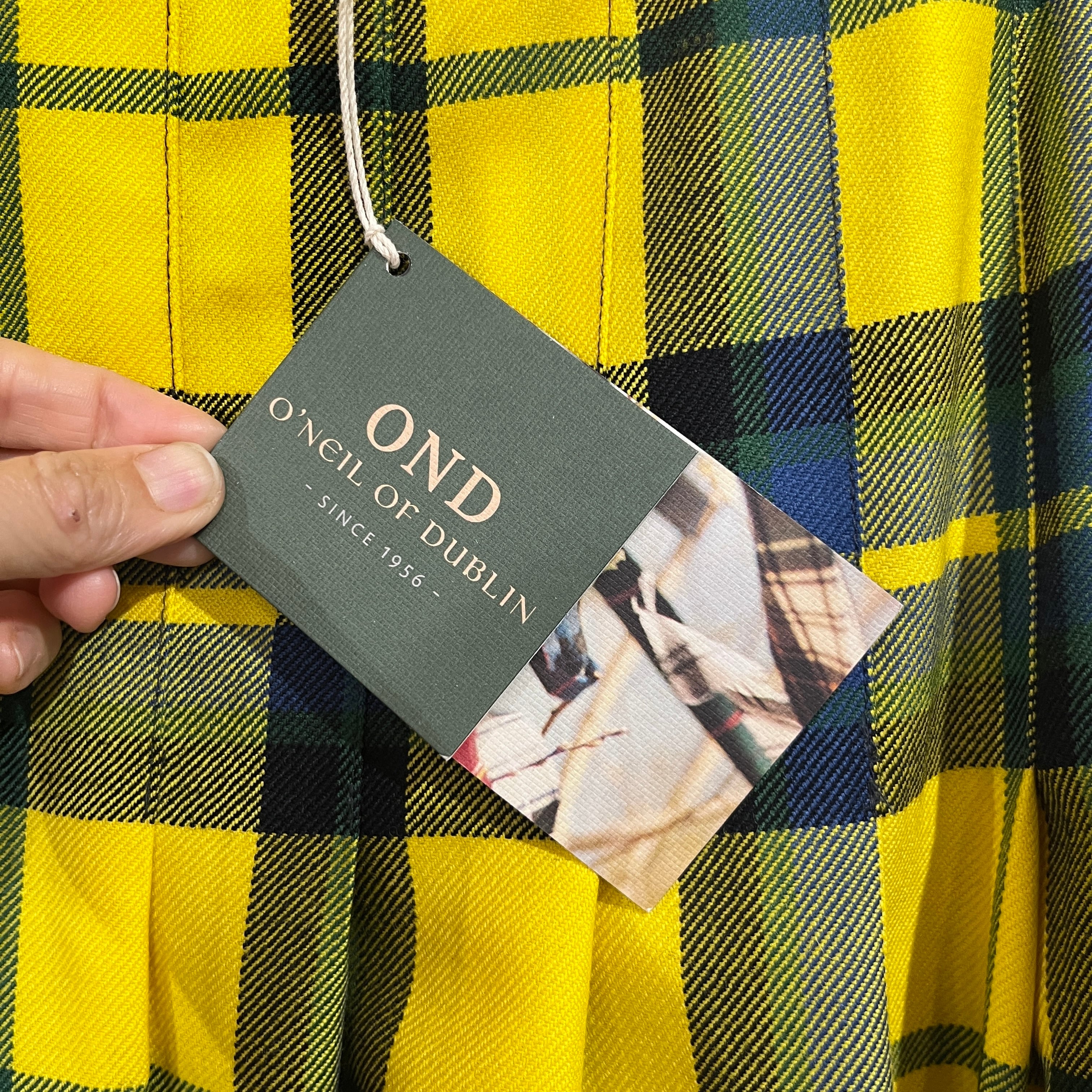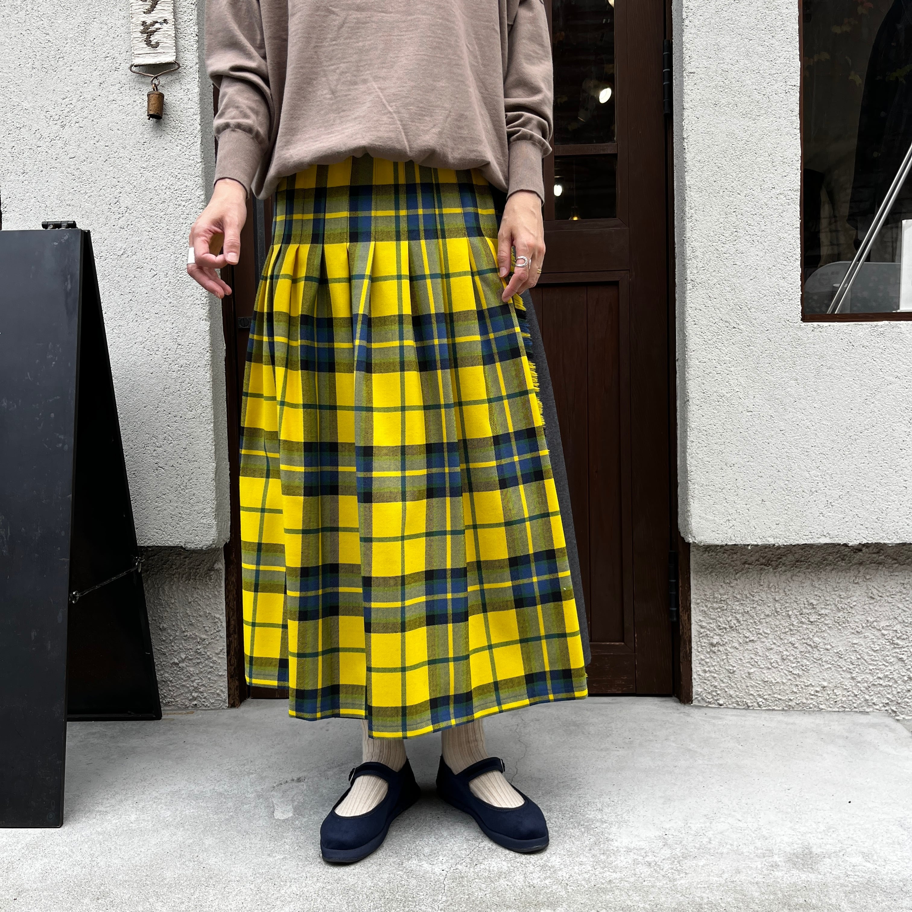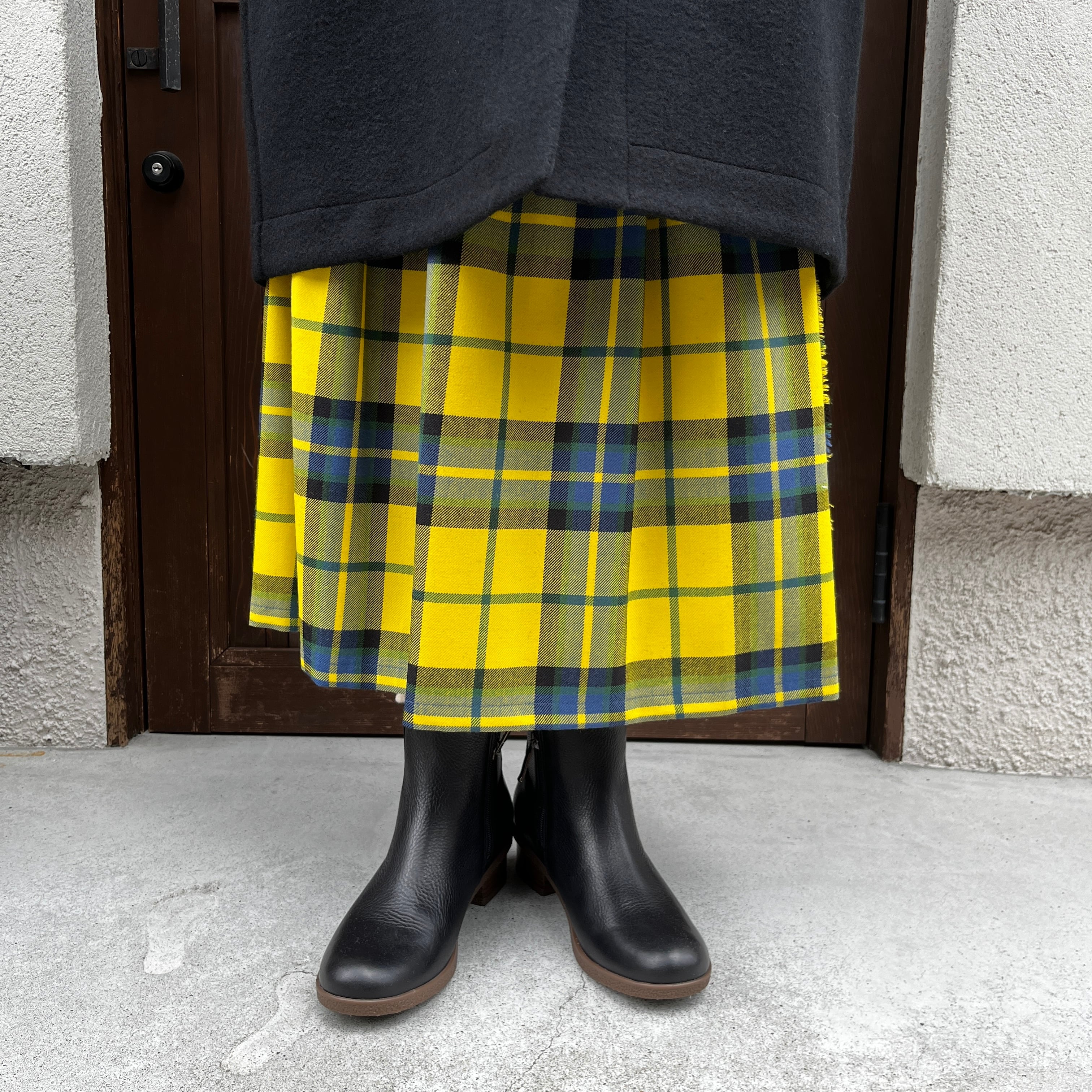 黄色の大きなチェックは、スカートでも甘くなりすぎず、オニールの伝統的で上質な雰囲気が感じられ、寒い季節の暗くなりがちなコーディネートに華やかさを足してくれます。