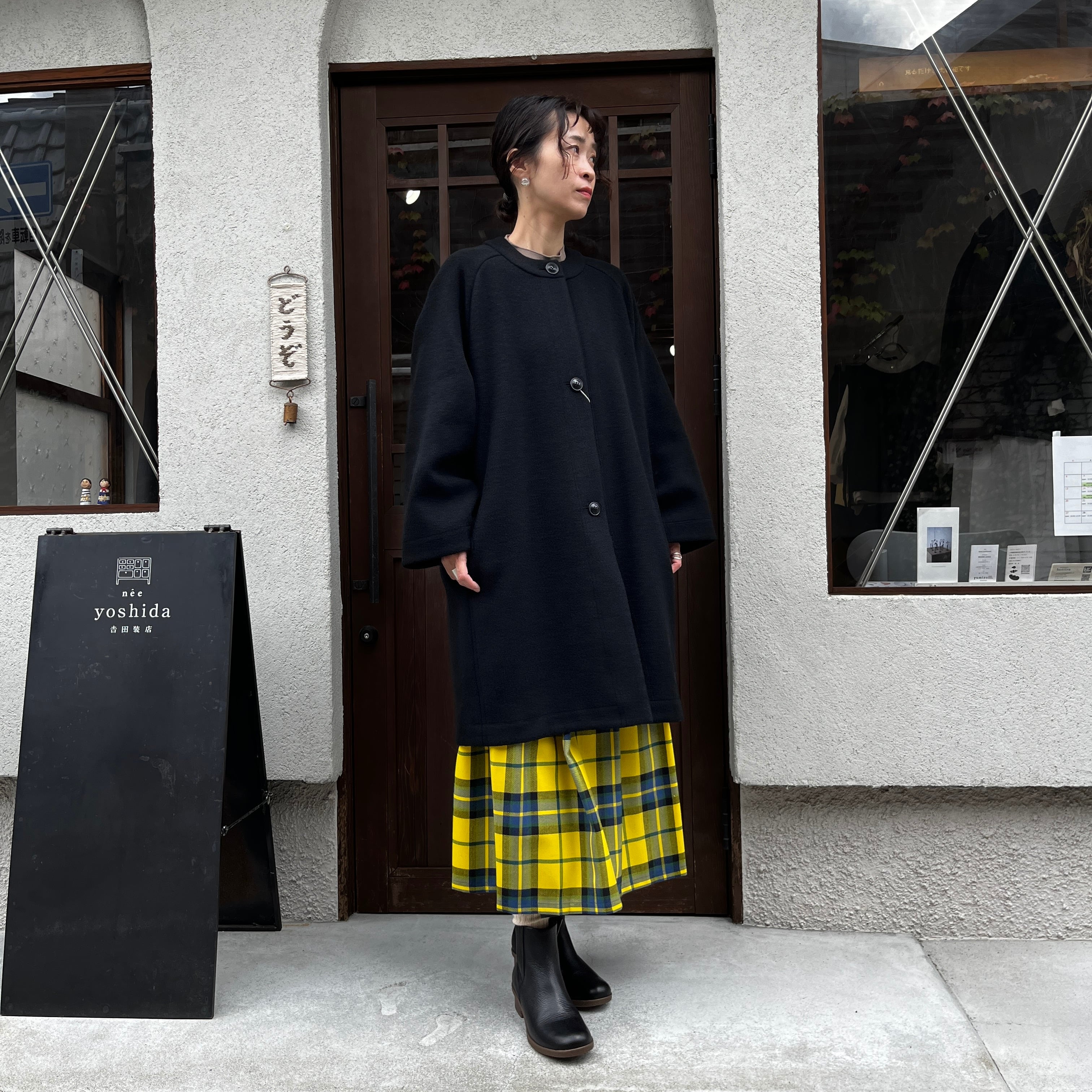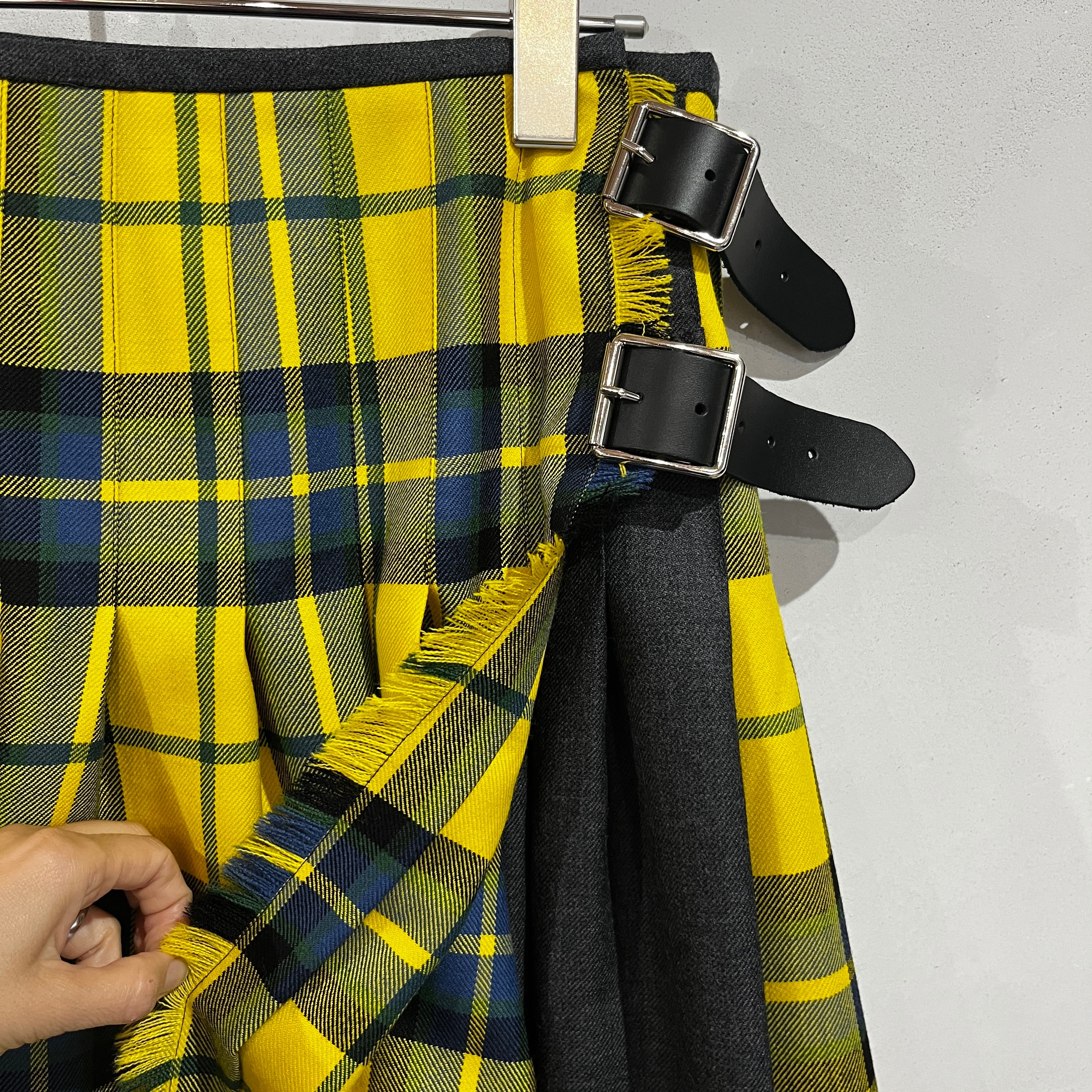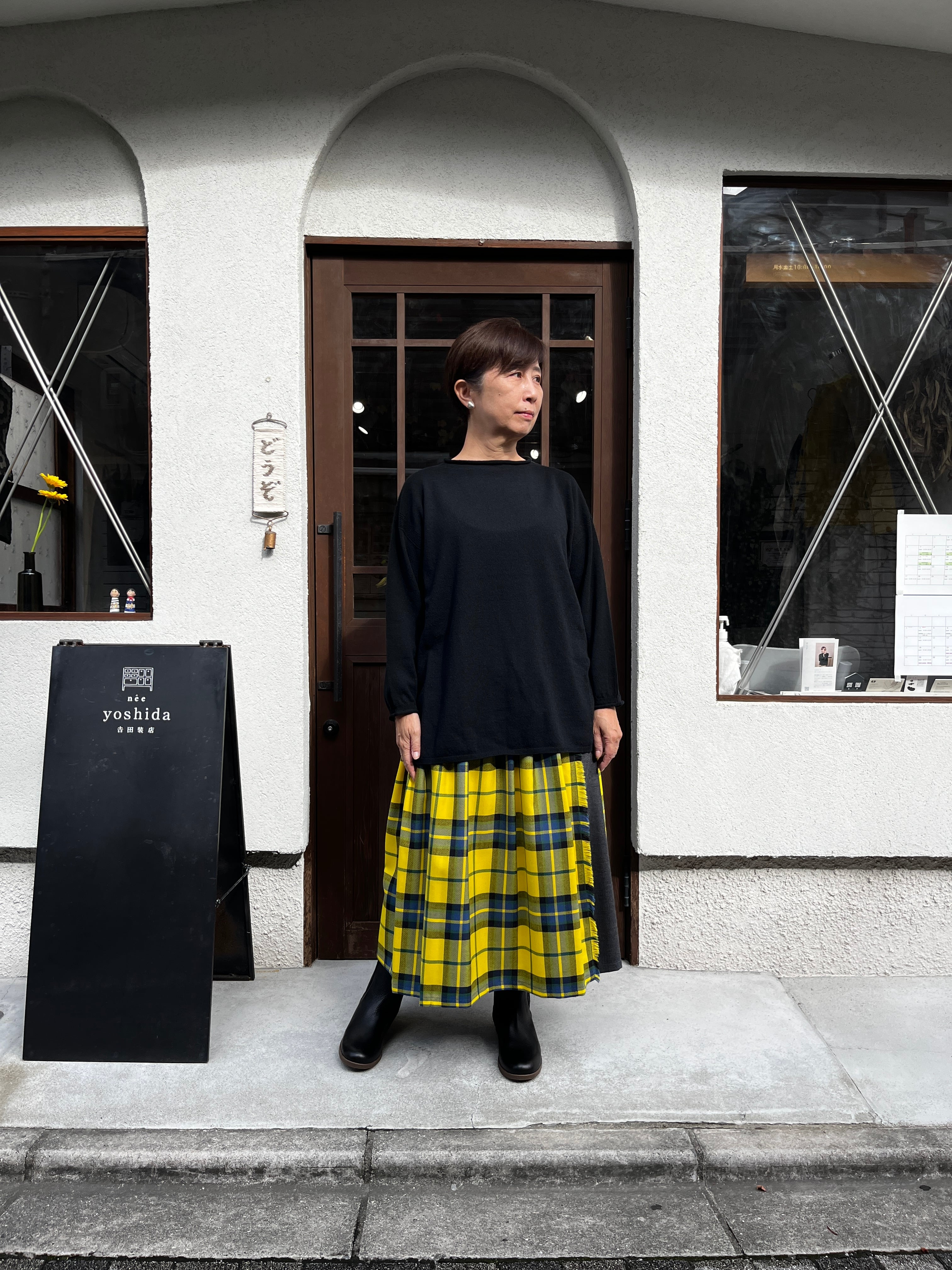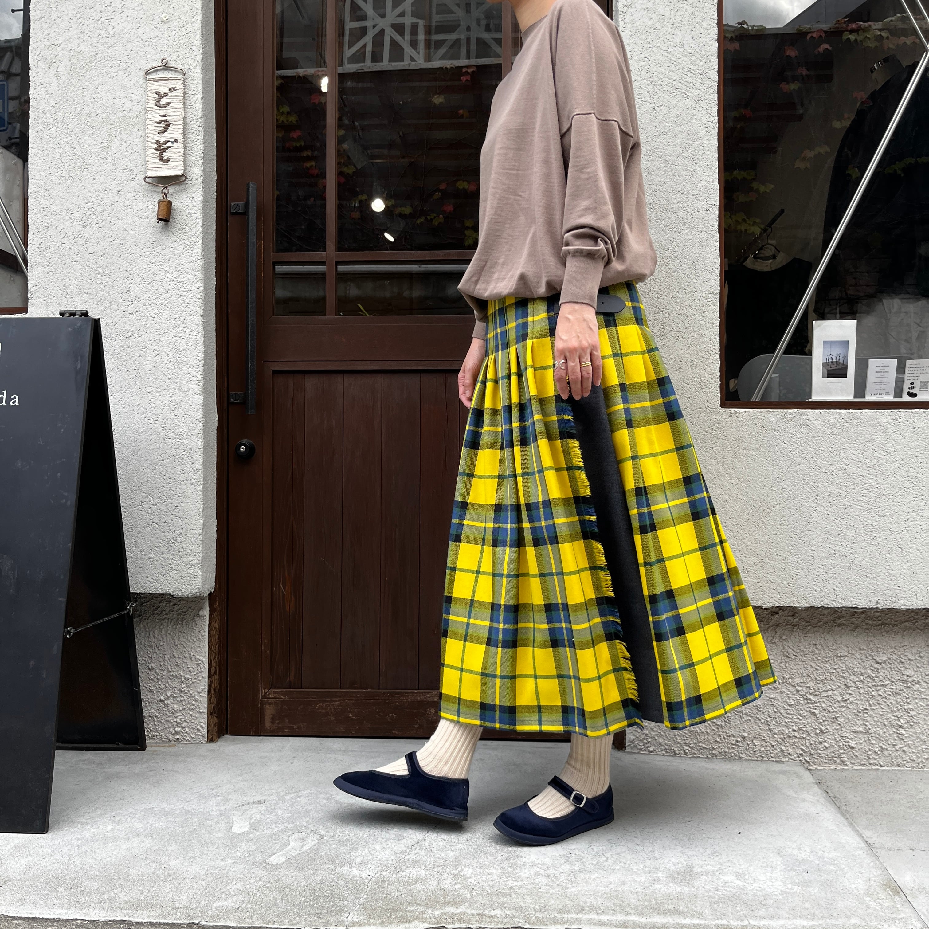 黄色の大きなチェックは、スカートでも甘くなりすぎず、オニールの伝統的で上質な雰囲気が感じられ、寒い季節の暗くなりがちなコーディネートに華やかさを足してくれます。